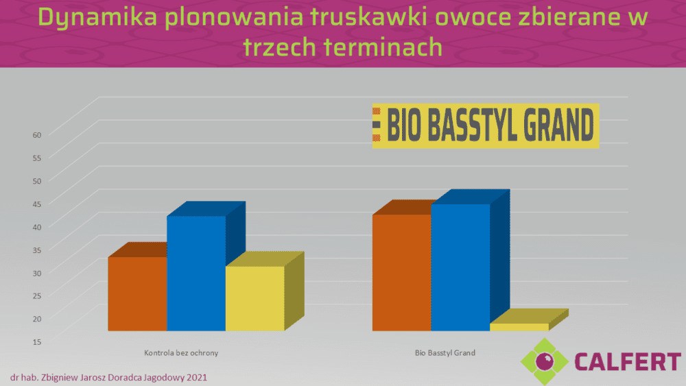 W doświadczeniu przeprowadzonym w 2021 roku przez zespół Doradcy Jagodowego wykazano, że zastosowanie preparatu Bio Basstyl Grand wyraźnie zmienia dynamikę plonowania truskawki. Mianowicie w pierwszym terminie zbioru uzyskano wyższy plon w porównaniu do grupy kontrolnej. Taki rozkład plonów może być szczególnie korzystny dla plantatorów dążących do jak najwcześniejszego wprowadzenia truskawek na rynek.
