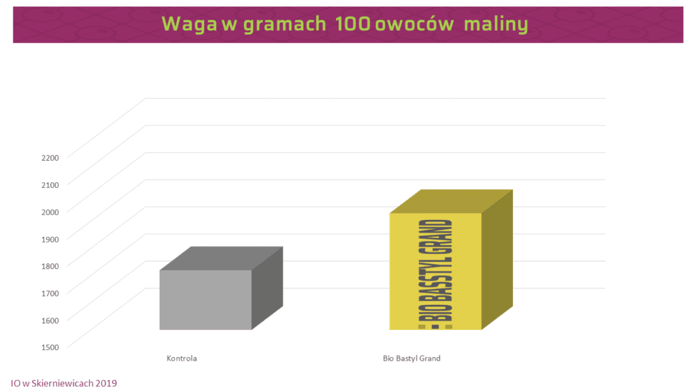 Korzystny wpływ nawozu Bio Basstyl Grand na plon wykazano również w przypadku maliny (IO w Skierniewicach, 2019 r.). Mianowicie z roślin traktowanych tym preparatem uzyskano owoce o średniej wadze blisko 1900 gramów na 100 owoców, podczas gdy w grupie kontrolnej było to około 1650 gramów/100 owoców.