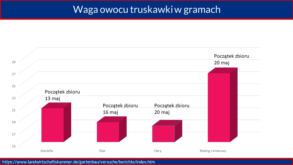 Odmianę „Grorielle” miałem okazje oglądać i kosztować jej owoce w czasie wizyty w Niemieckim instytucie badawczym. Odmiana ta zachwyciła mnie smakiem owoców oraz wczesnością wchodzenia w okres owocowania, na poniższej grafice widoczne są wyniki badań z Niemieckiego instytutu.