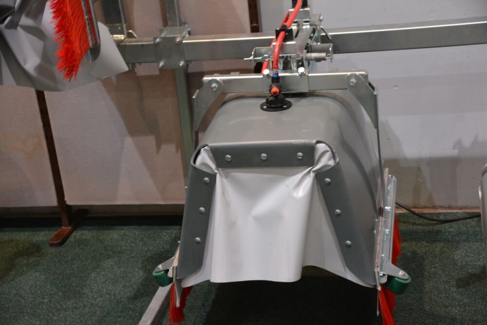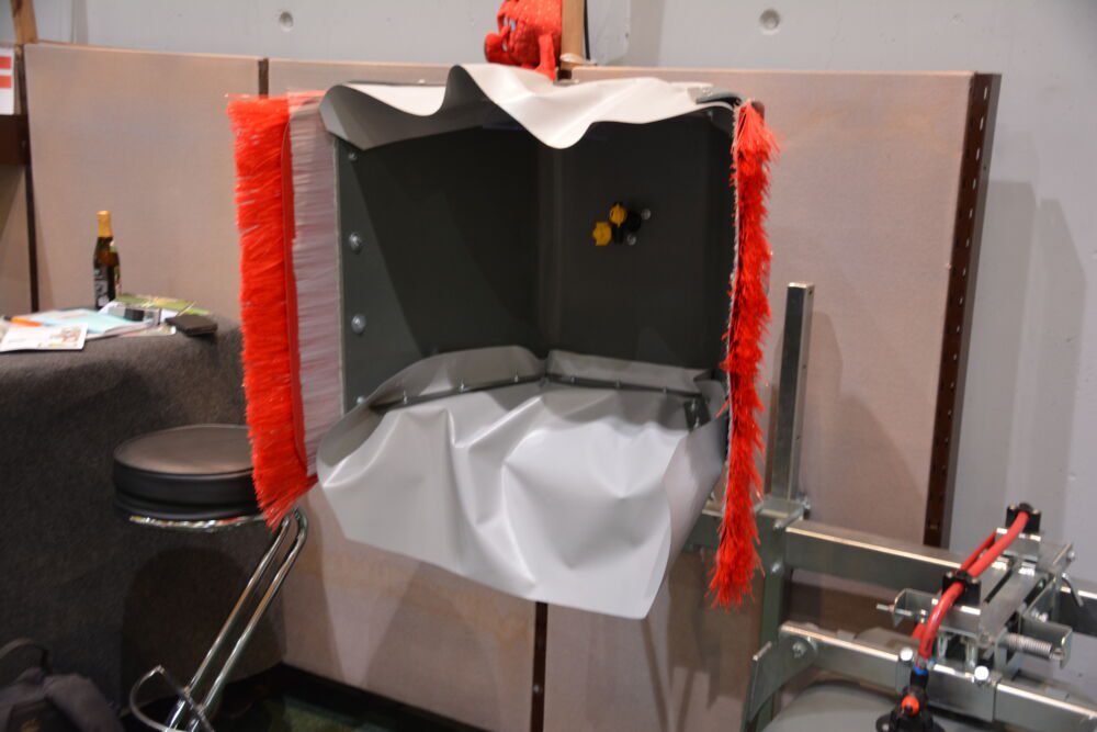 Zauważalną tendencją w Niemczech i Holandii jest coraz większa mechanizacja prac na plantacji. Tak, aby prace rąk ludzkich ograniczyć tylko do zbioru owoców, czasem też do sadzenia roślin. Inne prace wykonywane powinny być przez wyspecjalizowane sprzęty i urządzenia, szczególnie prace związane z pielęgnacją roślin. Targi expo se to doskonałe miejsce, aby podpatrywać nowe urządzenia, maszyny i technologie pomagające w uprawie truskawek. Poniżej kilka zdjęć z maszyn i urządzeń podpatrzonych w czasie targów expo se. Przystawka z osłoną do belki herbicydowej, celem opryskiwania powierzchni gleby pomiędzy zagonami.