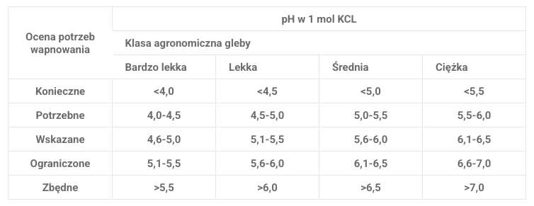 W 15 minucie podcastu, Jarek wspomina o tabeli oceny potrzeb wapnowania gleby w zależności od jej pH mierzonego w 1 mol KCl i klasy agronomicznej.
