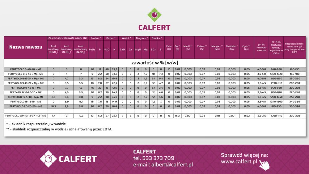Nawozy do fertygacji z linii FERDYGOLD posiadają informacje dotyczącą pH 1 % roztworu danego nawozu, przewodności elektrolitycznej (EC) 0,1% roztworu, oraz ilości gram nawozu jaką można rozpuścić w jednym litrze wody. W poniższej tabelki, przedstawiono dla wszystkich nawozów FERTYGOLD te ważne informacje.
