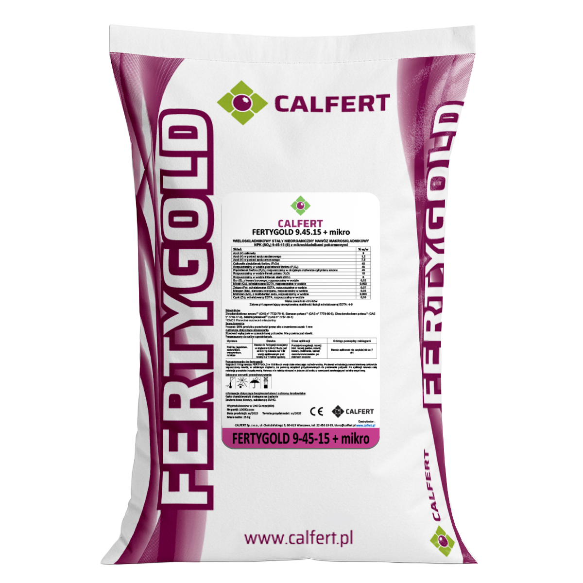 FERTYGOLD 9-45-15 + mikro to wieloskładnikowy nawóz NPK o wysokiej zawartości fosforu, wzbogacony mikroelementami schelatowanymi EDTA. Doskonale sprawdza się w fertygacji roślin sadowniczych, jagodowych i warzywniczych, szczególnie w początkowych fazach rozwoju. Jego formuła wspiera rozwój systemu korzeniowego, intensywne kwitnienie i prawidłowy wzrost roślin, a dzięki pełnej rozpuszczalności w wodzie zapewnia szybkie i skuteczne dostarczanie składników odżywczych poprzez instalacje nawodnieniowe.