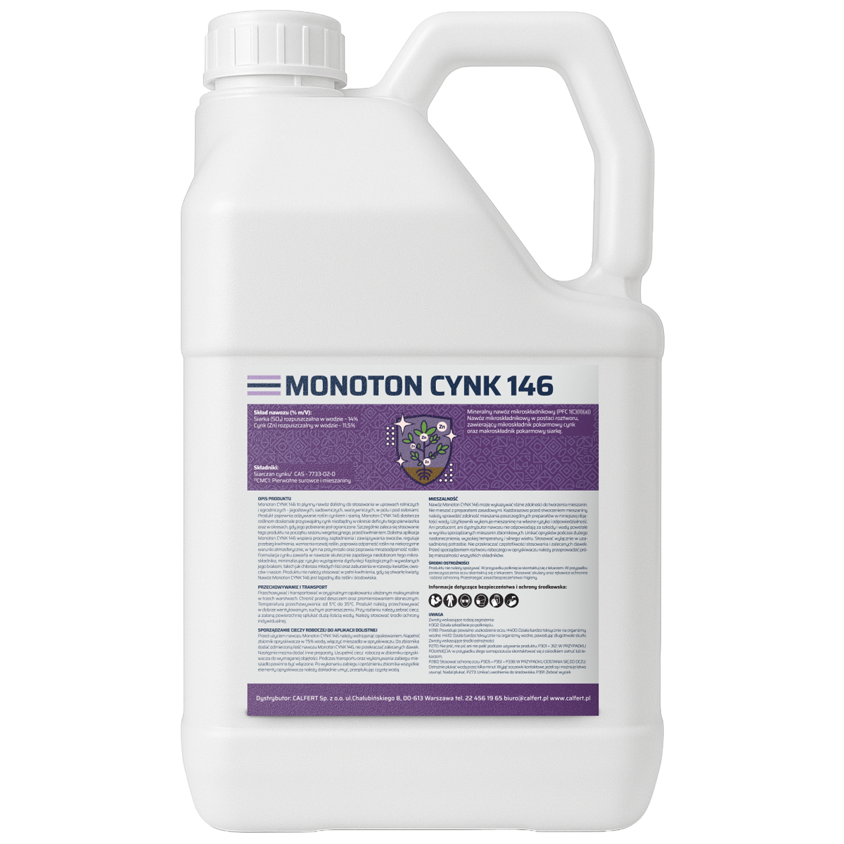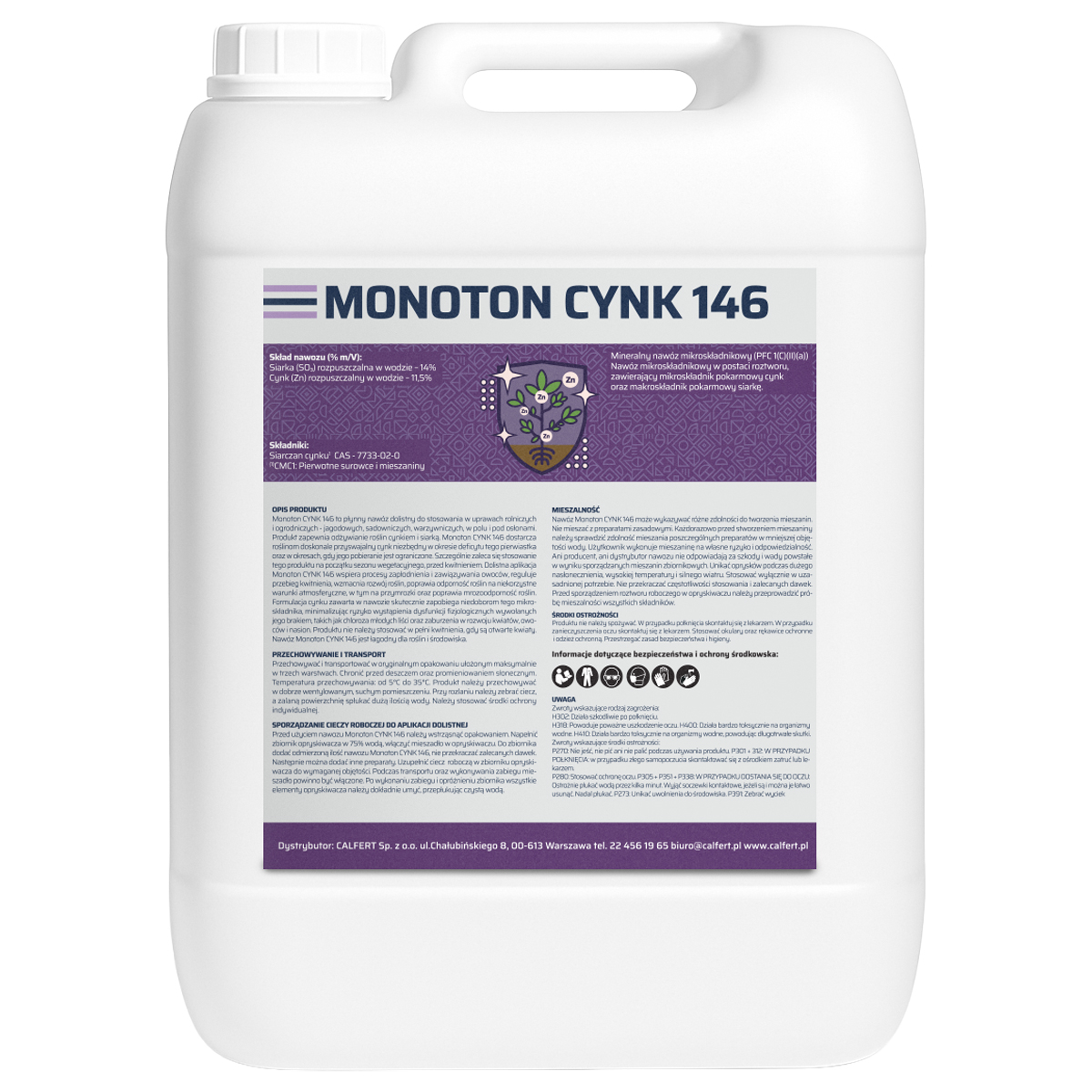 Monoton CYNK 146 to płynny nawóz dolistny z cynkiem i siarką przeznaczony do roślin rolniczych, sadowniczych, jagodowych, warzywniczych – uprawianych w polu i pod osłonami. Zawiera cynk 146 g/l w formie siarczanu cynku – dobrze rozpuszczającego się i łatwo pobieranego przez rośliny. Szczególnie zalecany do zabiegów wiosennych (przed kwitnieniem) oraz pod koniec wegetacji.