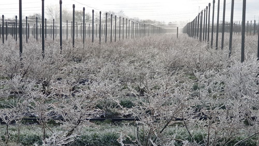 Sadownicy i plantatorzy roślin jagodowych nie pozostawali bierni. Przez wiele godzin w sadach jabłoniowych i na plantacjach borówek pracowały zraszacze nadkoronowe. To efektywna metoda ochrony antyprzymrozkowej, wykorzystująca ciepło wytwarzane przez zamarzającą wodę, chroniące delikatne tkanki roślinne przed uszkodzeniem.