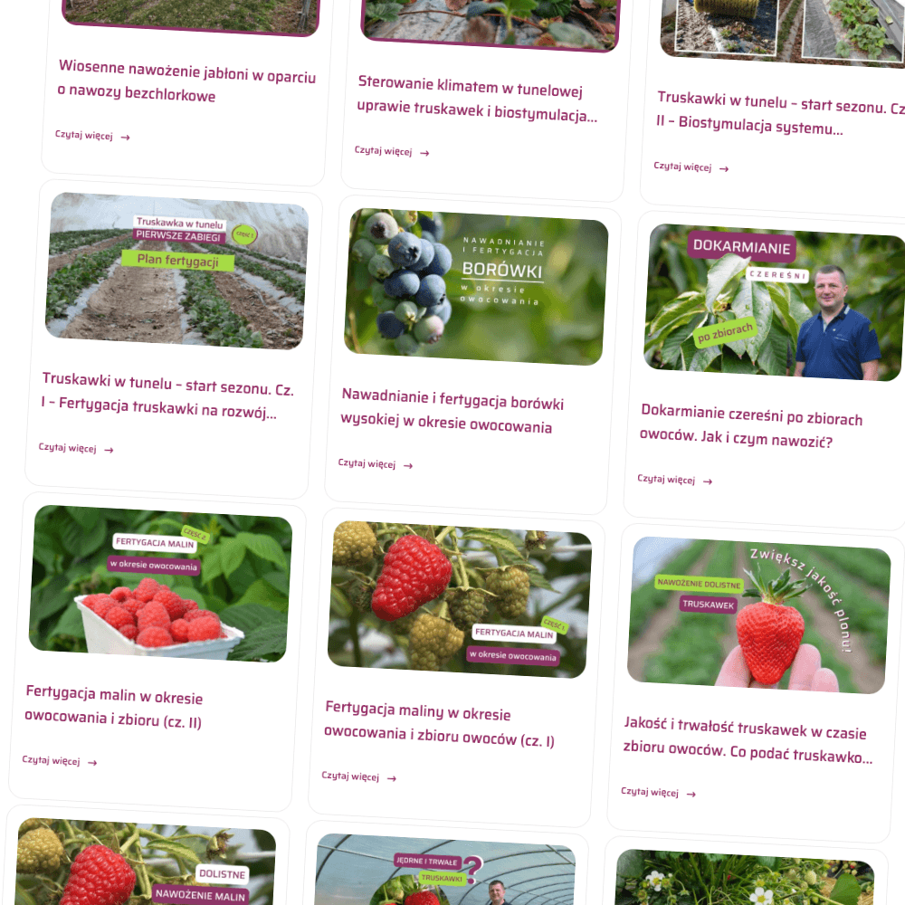Materiały wideo tworzone przez ekspertów firmy, skierowane do producentów owoców i warzyw. Publikowane są tu zarówno dłuższe filmy omawiające zagadnienia uprawowe i konkretne zalecenia agrotechniczne, jak i krótkie, praktyczne porady w formie dynamicznych materiałów. To źródło specjalistycznej wiedzy, wyników doświadczeń oraz inspiracji do codziennej pracy na plantacji.